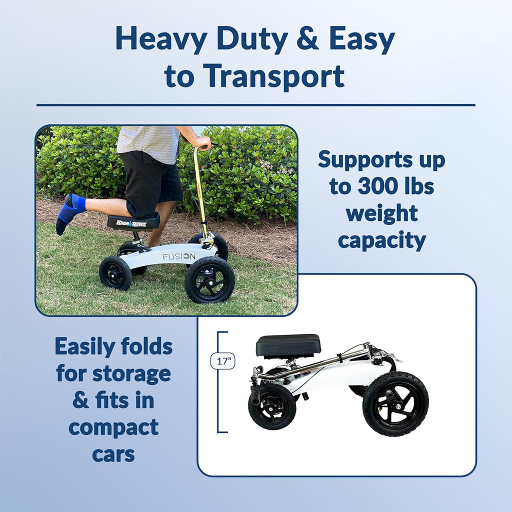 • Heavy Duty & Fully Adjustable: The Knee Rover Fusion's Heavy Duty premium steel frame supports up to 300 lbs weight capacity. This knee scooter crutch alternative also offers an adjustable knee pad and handlebar and is recommended for users with a height of 4’ to 6’6”. This kneeling walker also folds quickly for easy transport and can fit in compact cars.