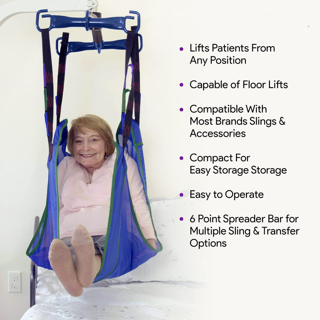 • Compatible with all slings: The 6 point spreader bar allows you to use a variety of or other brand patient lift slings for a wide range of transfers, from floor to chair, to bed, to commode or elsewhere.