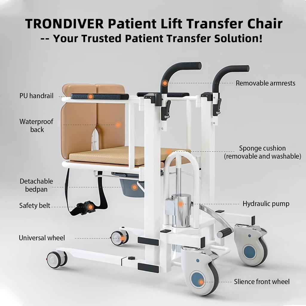 The adjustable seat height (ranging from 17-24 inches) allows for customized comfort and optimal positioning for both the caregiver and the user. The chair’s hydraulic lift system ensures smooth, controlled movement, reducing strain and making transfers effortless.