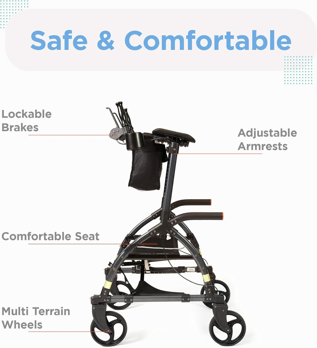 • Comfortable & Adjustable: Featuring a wide seat, adjustable padded armrests, a detachable backrest & 90-degree rotating hand grips, the UPWalker adjusts to be comfortable for users from heights from 4’7” to 5’10”
