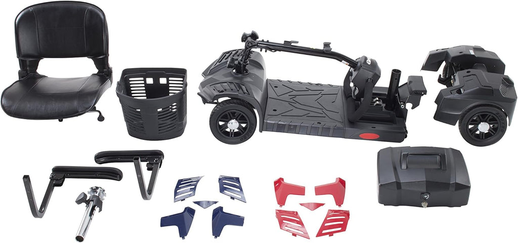 • Portable: These folding mobility scooters quickly disassemble into five lightweight pieces that can compactly fit in the trunk or back seat so you can take your travel scooter on the go