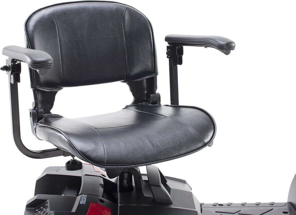• Comfortable Seating: The chair scooter features height-adjustable swivel seat with fold-down backrest and adjustable padded armrests for comfort