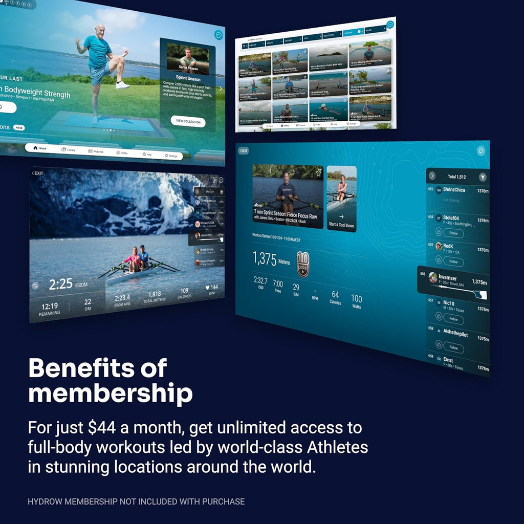• GET A MEMBERSHIP, THEN GET STARTED. For just $44/month, unlock over 5,000 at-home workouts for all fitness levels. Explore a range of workout styles, including cardio, strength, recovery, and more — all led by world-class instructors in stunning locations around the world. (NOTE: Memberships are sold separately from rowing machines.)