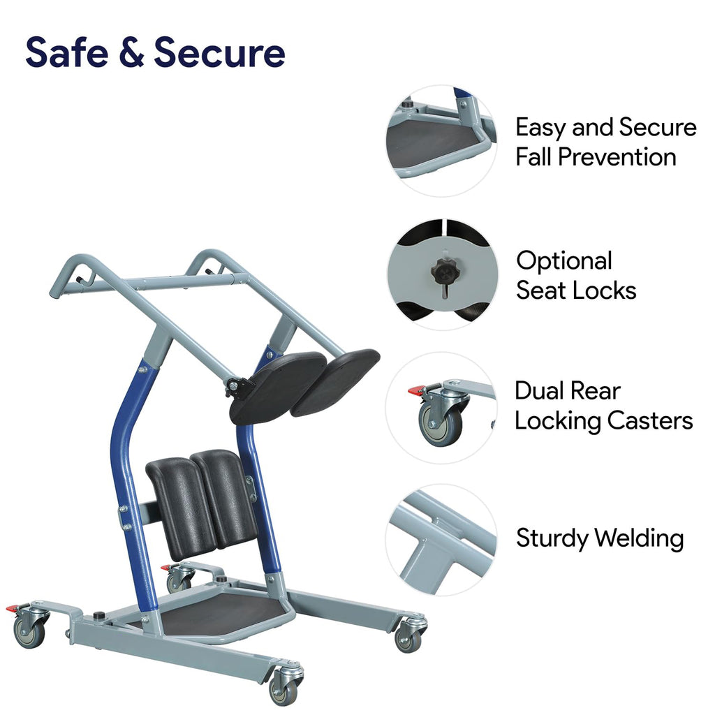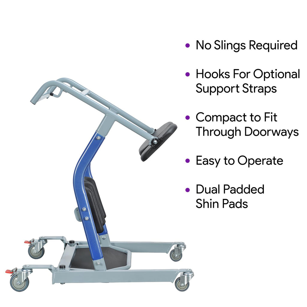 • STAND ASSIST PATIENT LIFT: Designed to help transfer patients who can stand enough to support 60-70% of their body weight, the stand assist prevents falls, increases safety for patient and caregivers, and provides more dignity than electric or hydraulic patient lifts.