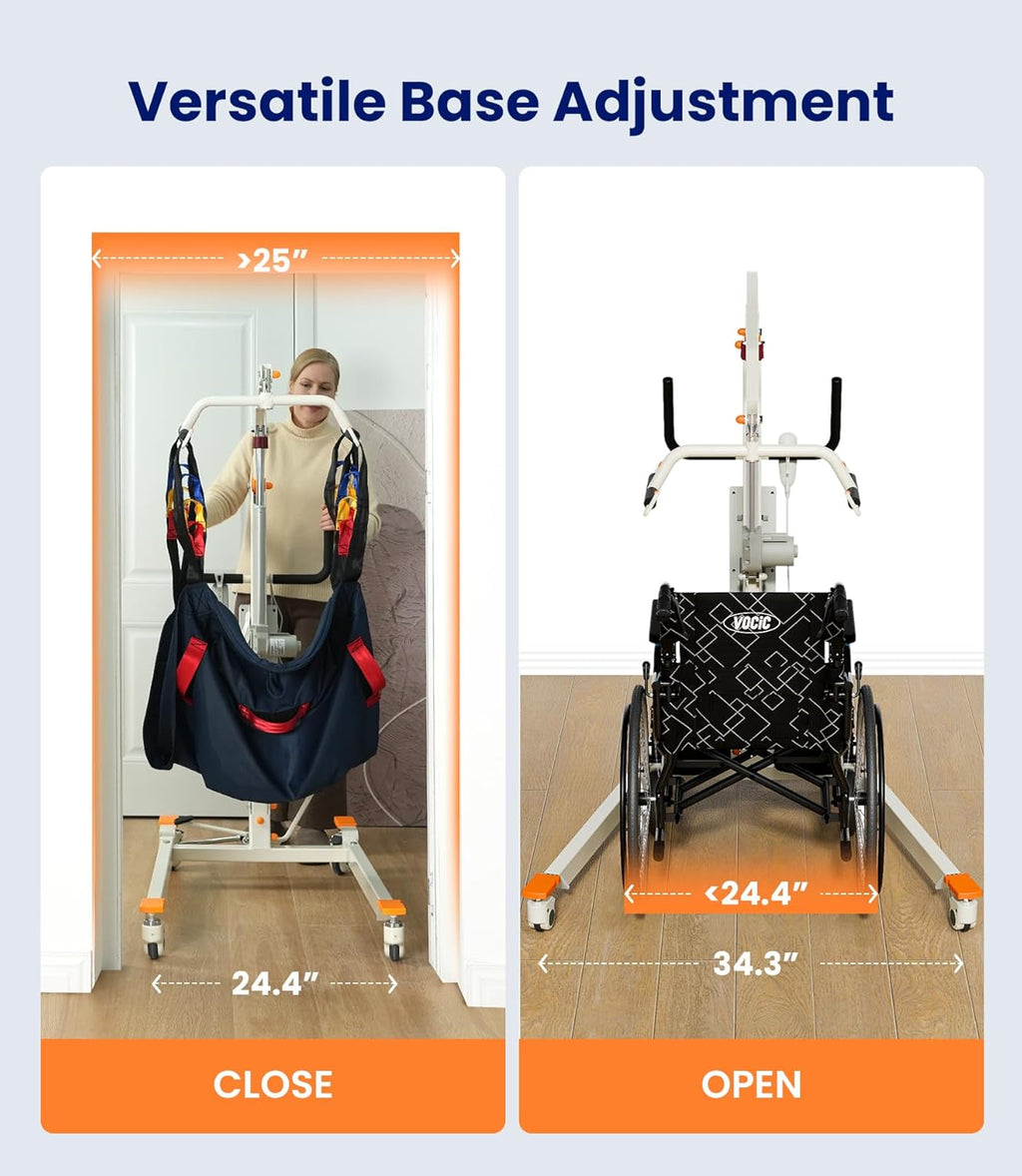• [Versatile Transfers] - This transfer lift is tailored to fit most homes and care facilities. The base width is adjustable, ranging from 24" to 34", ensuring it can effortlessly pass through doorways and accommodate wheelchairs. With a base height of 5.5", it can be conveniently positioned under furniture like beds and sofas.